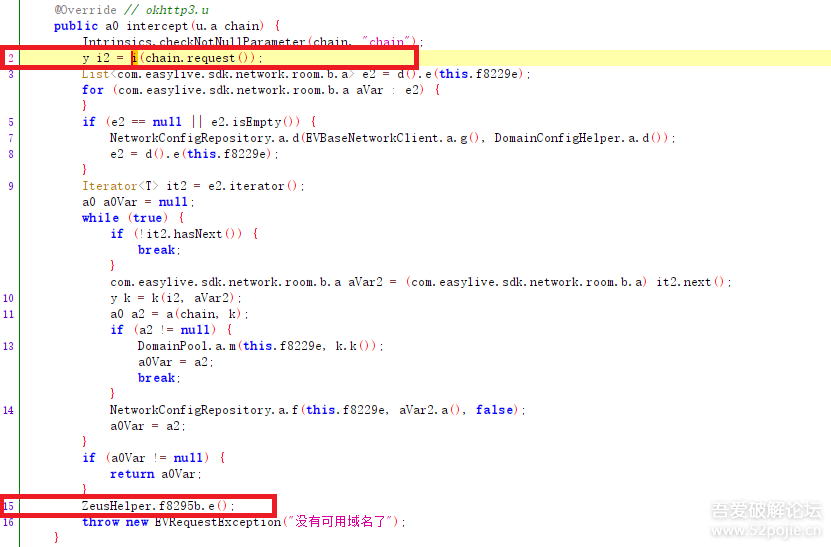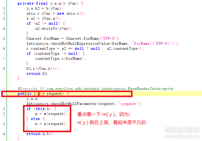 眼尖的应该一下子就发现了关键位置,第二行代码通过 chain.request() 得到 Request 类然后做了处理;这里的 i 是抽象函数,根据 BaseHeaderInterceptor 的子类 d.m 找到了 i 的函数体,如下: