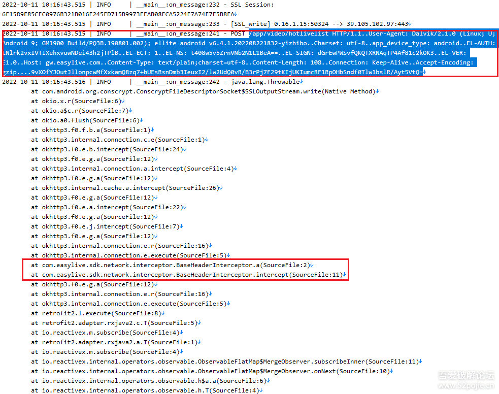 可以看到其中关键的 header 都是 EL 开头,请求体也被加密了,所幸返回的都是明文。在上上图调用堆栈中发现了 Interceptor 的踪迹,看着名字应该是重写的 intercept(Chain chain),接下来我们看一下。