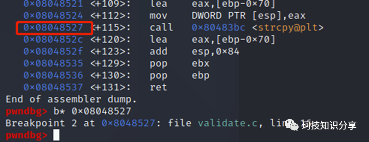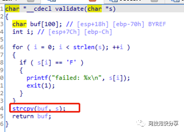 还是手动调试找偏移量,这里gdb里b strcpy无法下到断点,直接b main或者b validate的话由于有for循环,手动跟踪到strcpy也比较麻烦。我们可以在代码中下断。