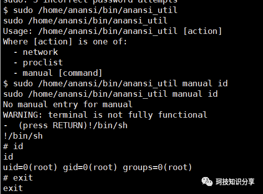 有个anansi_util的二进制文件,但没有s权限,用户也是它自己,sudo -l之后发现它拥有无密码sudo的配置。