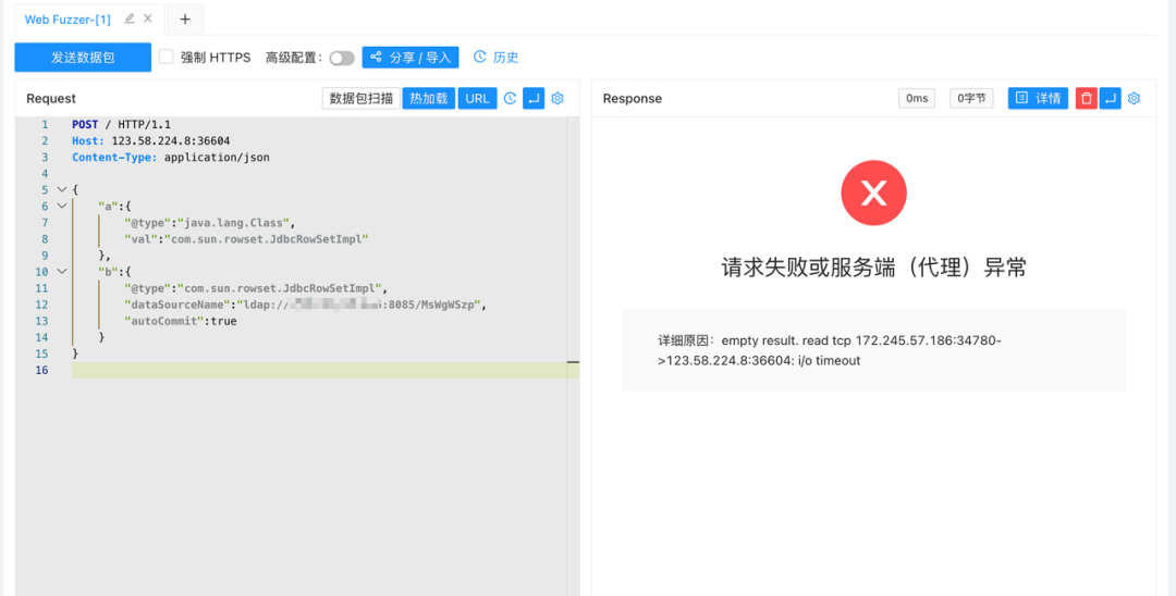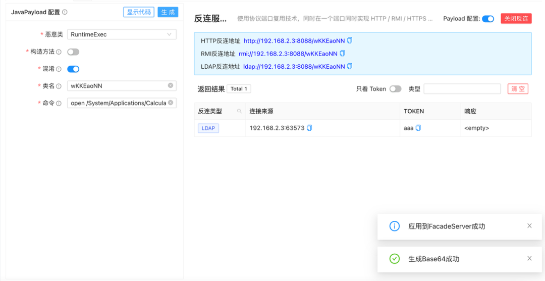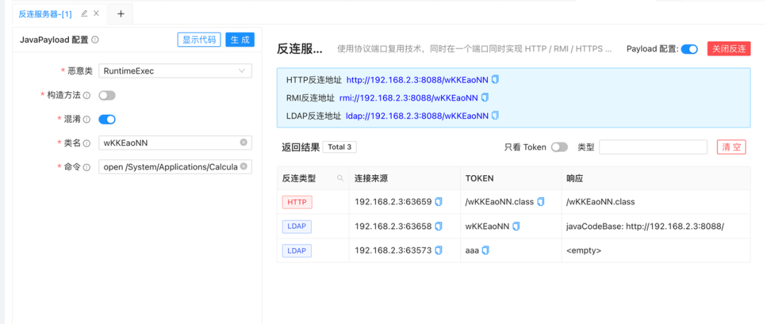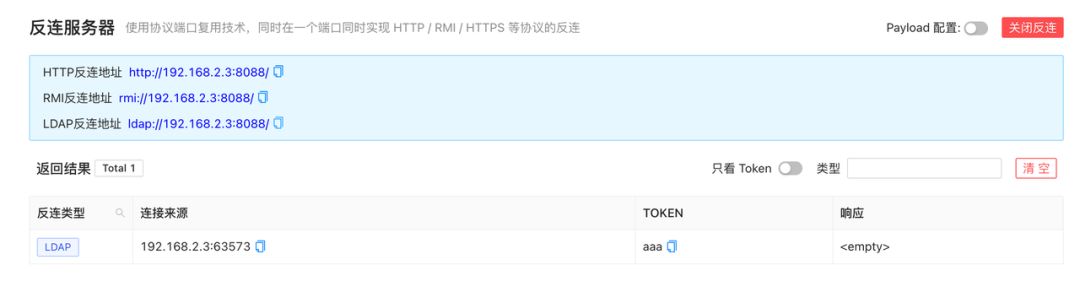 如图,反连列表中可以看见成功收到 LDAP 和 HTTP 请求,说明目标成功加载了恶意类(如果只收到 LDAP 请求,没有 HTTP 请求,可能是目标未开启
