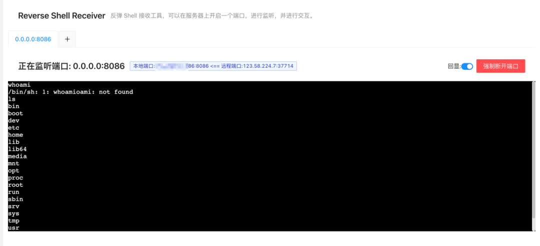 连接成功后可以看到反连地址的 IP 已经变为 Bridge 服务器的 IP 了,接下来的操作和本地启动相同。
