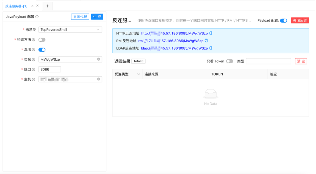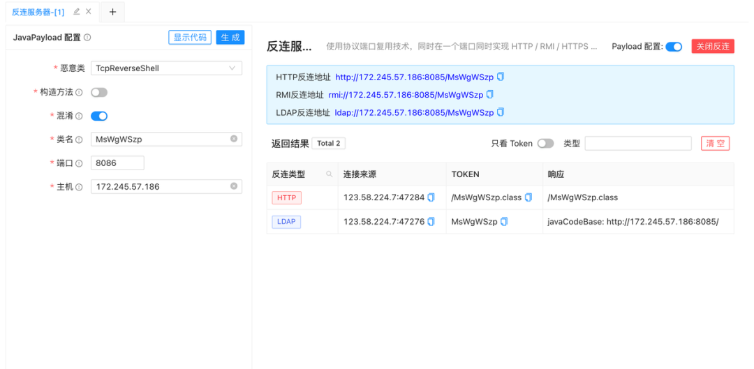 在配置好恶意类后,点击启动反连,就可以使用当前恶意类直接启动反连了(如果配置了公网反连则使用此配置启动,否则使用本地启动,如果启动失败,请自行在高级配置里配置反连地址),如图