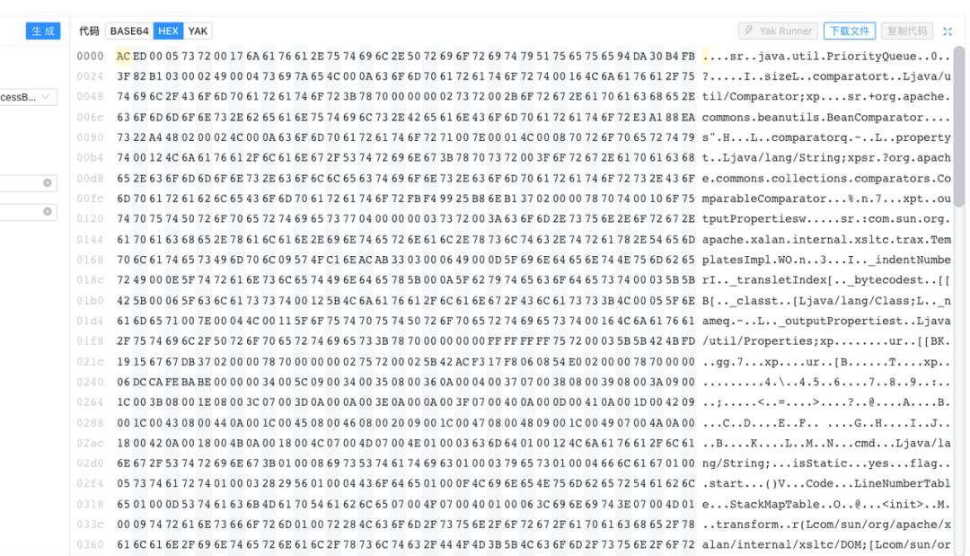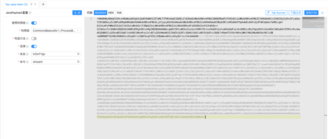选择利用链和恶意类后,会出现配置表单,类名默认是随机生成的,填写所有表单信息,点击生成,就可以在右侧看到生成的 payload ,点击上方可以切换展示方式。