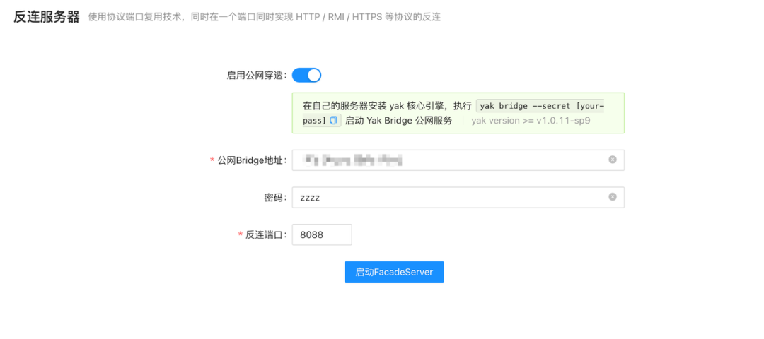 对于公网的目标,反连服务就需要在公网监听了,一是可以将Yak引擎公网部署,二是可以在公网搭建Bridge,这里主要讲下第二种方法。