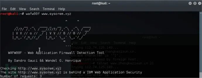 WafW00f是Python脚本,用于检测网络服务是否处于网络应用防火墙保护状态,极其有用。使用WafW00f检测网络服务器和网络传输之间是否存在网络应用防火墙,这不仅可以发展测试战略,而且还能开发出绕过网络应用防火墙的高级技术。简单用法 wafw00f URL