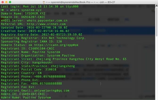 例如下面 whois www.sysorem.xyz 查看www.sysorem.xyz这个域名的注册信息