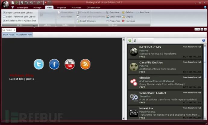 Maltego:社工神器:Maltego是用来对来自互联网的信息进行收集、组织、可视化的工具。它可以收集某个人的在线数据信息 –包括电子邮件地址、博客、Facebook中的朋友,个人爱好、地理位置、工作描述,然后可以一种更为有用、全面的形式展现出来。