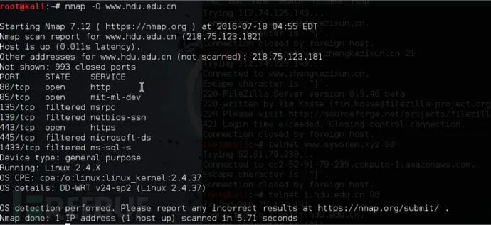 识别目标主机的操作系统,首先,可以帮助我们进一步探测操作系统级别的漏洞从而可以从这一级别进行渗透测试。其次,操作系统和建筑在本系统之上的应用一般是成套出现的,例如LAMP或者LNMP。操作系统的版本也有助于我们准确定位服务程序或者软件的版本,比如一般情况下windows server 2003 搭载的IIS为6.0,windows server 2008 R2 搭载的是IIS7.5。