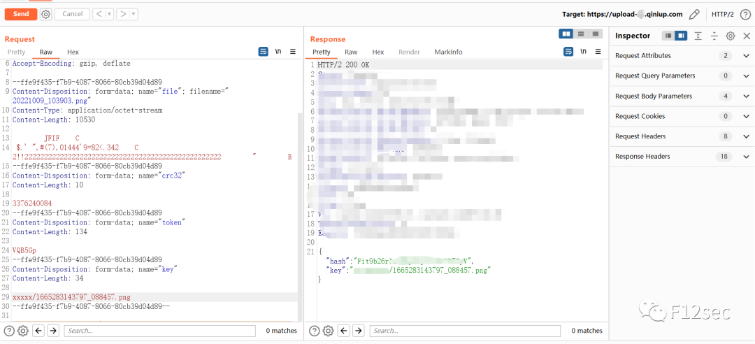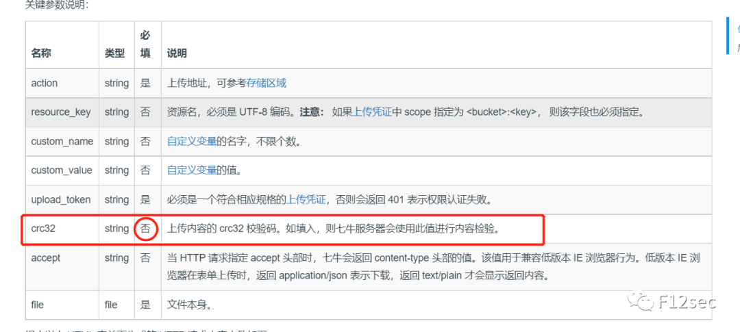 crc32参数是非必填项,仅在客户端发送的包中有crc32参数时,七牛云的对象存储服务器才会对其进行crc检验,所以数据包中的crc32参数删除后,即可绕过。