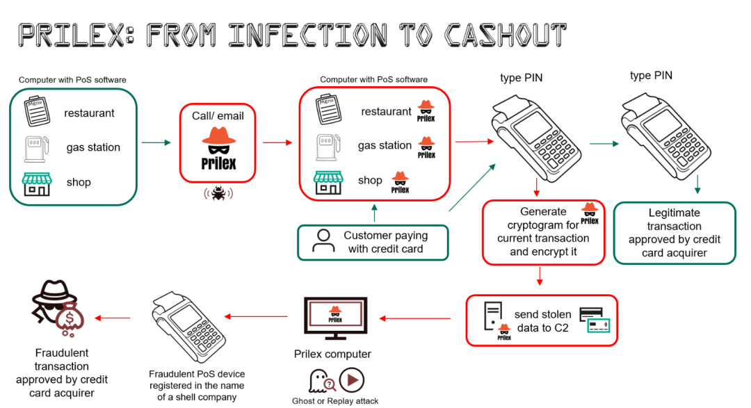 该方法称为GHOST交易,包括一个窃取组件,该组件在交易期间抓取PoS软件和用于读取卡的PIN键盘之间的所有通信,以获取卡信息。随后将其传输到命令和控制(C2)服务器,允许威胁参与者通过以假公司名义注册的欺诈性PoS设备进行交易。