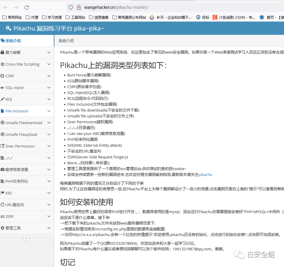 这也是一个比较知名的靶场,pikachu,我想大家也是经常用到,这里我就不介绍了,里面有很多适合新手对于漏洞理解的练习