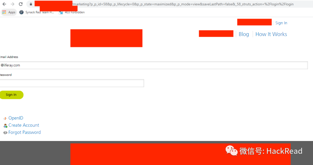 对于那些不熟悉Liferay的人来说,CMS为应用程序工作流使用了portlet,它的参数是数字中的p_p_id。对于该应用程序,可以通过将参数值更改为58来访问登录portlet。在正常的登录页面中,只有登录表单是可访问的。然而,通过直接访问portlet,可以达到Create Account功能,然后在不需要适当的授权情况下就可以进行自注册并访问内部应用程序。