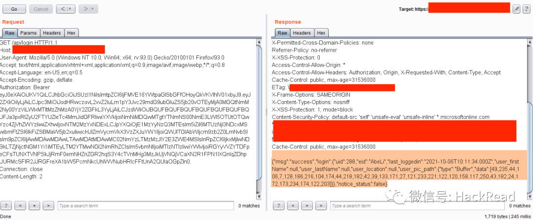 然而,一些JS文件不需要身份验证就可以访问。测试显示,该应用程序使用了安全登录后通过Microsoft SSO系统发送的JWT令牌。在后端机制上,存在一个安全错误配置,即不检查是否为特定的应用程序生成了JWT令牌。相反,它接受任何具有有效签名的JWT令牌。因此,使用来自微软网站的JWT令牌示例如下: