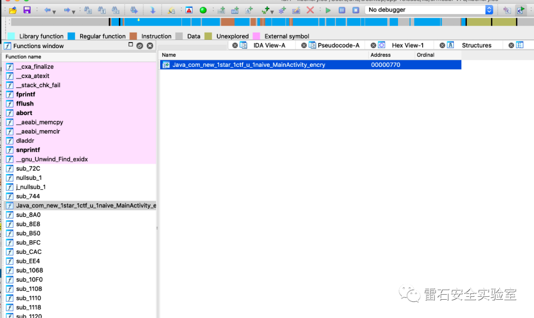 encry是写在native层,对apk解包,取出对应的so(libencry.so)拖进ida。 可以看到是静态注册的,直接能在导出函数里找到。