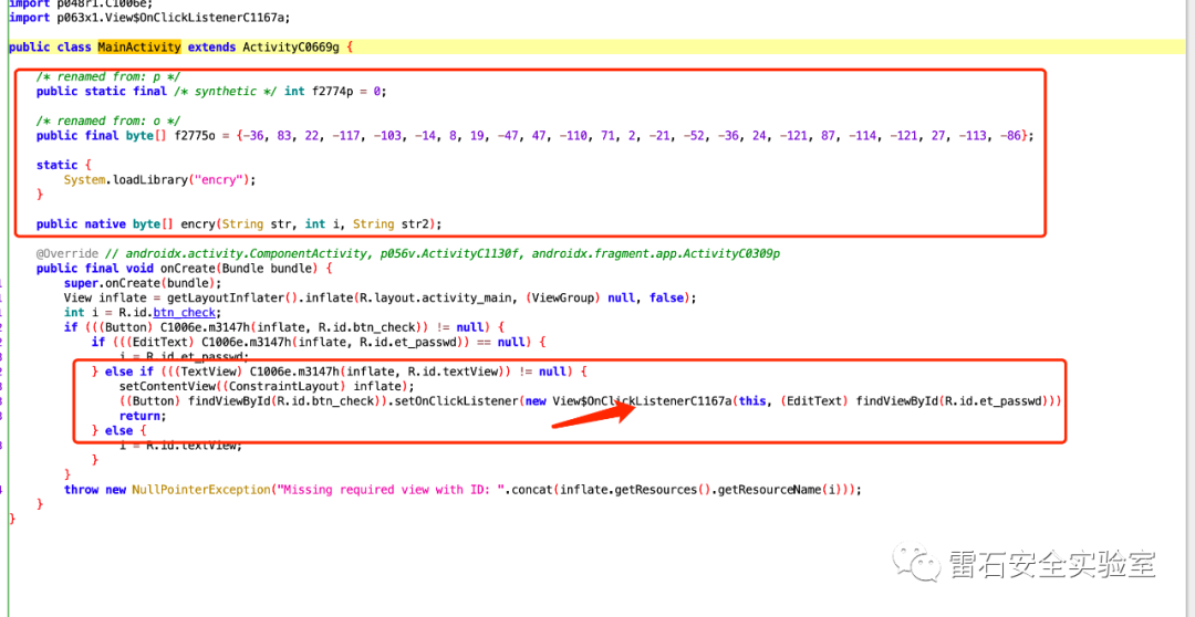 找到对应的类,一看上面就是一个byte数组,一个loadLibrary,一个native函数,so逆向跑不了。 下面看到对应的按钮点击事件。