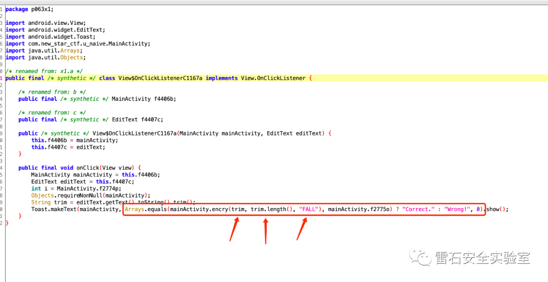 继续跟进去看,找到了核心的逻辑,是通过encry函数处理输入字符串,返回一个byte数组,然后和前面的byte数组比较是否相等,那前面的byte数组应该就是加密后的flag,我们要做的就是逆出来。