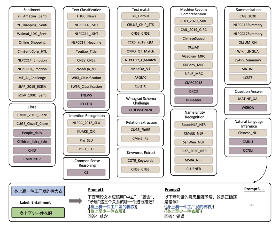 如上图所示,以NLI任务为例,原任务中的文本关系的标签和输入信息被转化为流畅通顺的自然语言形式,更符合自回归语言模型的训练形式。