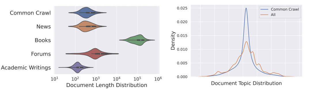 最终处理完的数据量为 262B tokens。为了更好的平衡各个数据源的比重,也要对数据进行不同比重的采样。最终整体数据集的Topic 分布相比 Common Crawl 更加平滑。