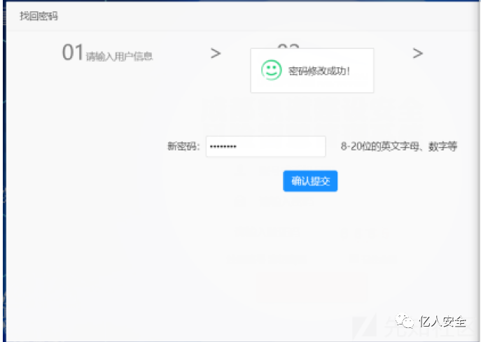 填入验证码,直接跳转到第三步修改新密码,填入新密码后,点击提交