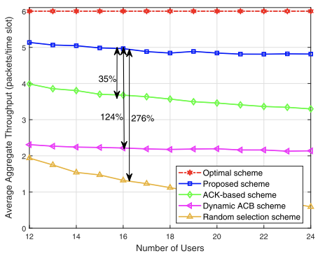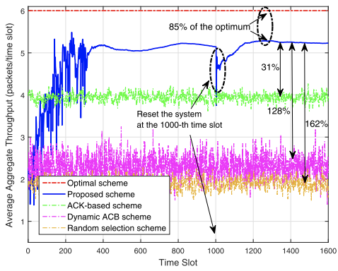 在800个时隙后达到了85%的最优平均总吞吐量,分别比基于ACK的方案、基于ACB的方案和随机选择方案高31%、128%和162%。在时隙1000中,将所有用户的平均吞吐量设置回零。注意到:该方案在150个时隙后快速从新的初始状态恢复,并保持了85%的平均总吞吐量。
