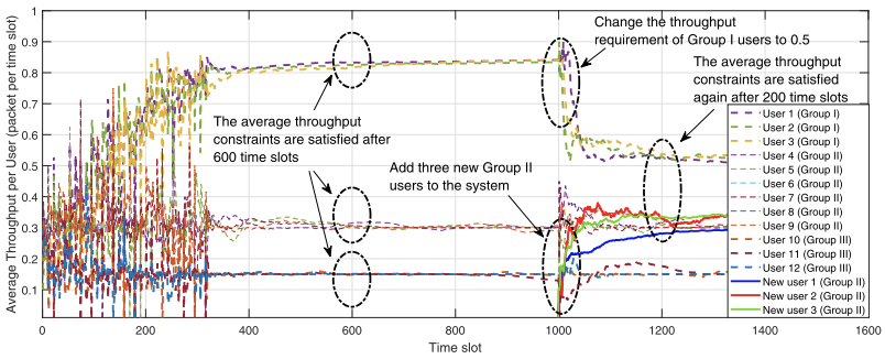 结果表明,在收敛后,所有用户的平均吞吐量需求都得到了满足;在第1000个时隙中,添加了三个新的第二组用户,将第一组用户的吞吐量要求从0.7更改为0.5:该方案能够适应新的网络拓扑结构和新的吞吐量要求。