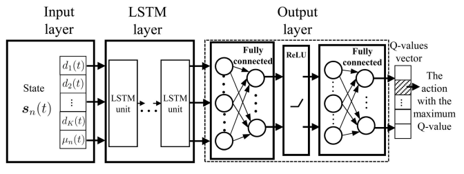 通过建立给定状态与所有可能动作的对应Q值之间的映射,用具有可学习参数Φ的DRQN近似Q值。基于系统过渡历史(经验重放数组)更新参数,以提高Q值近似的精度。
