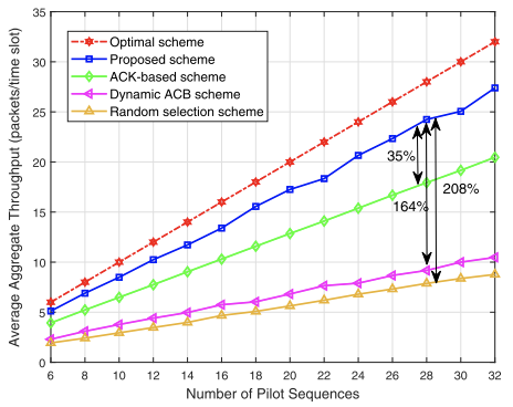 当导频序列数为28时,该方案的平均总吞吐量分别比基于ACK的方案、基于ACB的方案和随机选择方案高35%、164%和208%。平均总吞吐量的近似线性增长表明,只要用户数与导频序列数之比固定,所有方案的导频序列选择冲突概率都不会发生显著变化。