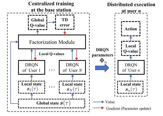 左侧:在基站的集中训练阶段,基于全局信息联合训练所有用户的DRQN。因式分解模块仅在训练阶段使用,以确保全局Q值可以被因式分解。训练之后,基站向用户发送DRQN的可学习参数;