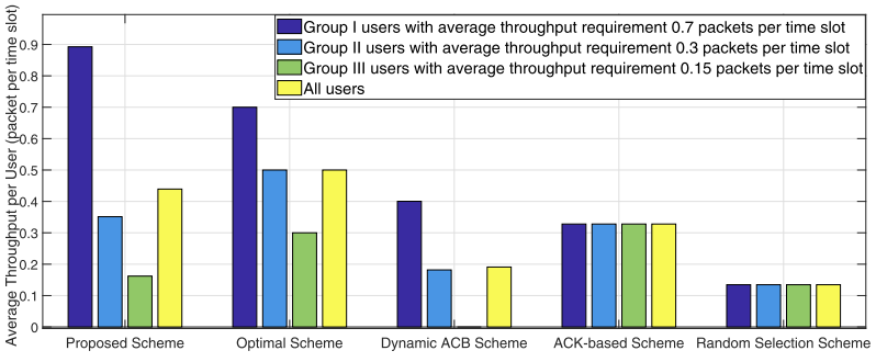 最优方案和所提方案中的所有用户都能满足其平均吞吐量要求;对于基于ACB的方案、基于ACK的方案和随机选择方案,均未满足。后两者所有用户都能获得相同的平均吞吐量,因为这两种方案都没有考虑吞吐量要求。因此特仿真评估所提方案、基于ACK的方案和随机选择方案在没有用户特定吞吐量要求的情况下的性能。