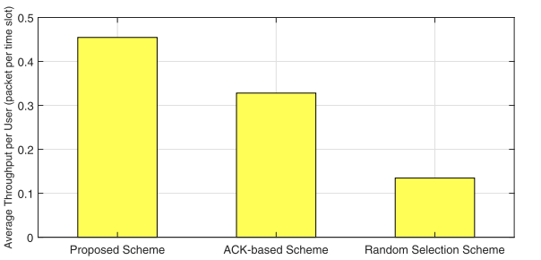 在所有考虑的方案中,所提出的方案实现了最高的每用户平均吞吐量。特别是,该方案的每用户平均吞吐量分别比基于ACK的方案和随机选择方案高34.6%和222.1%。