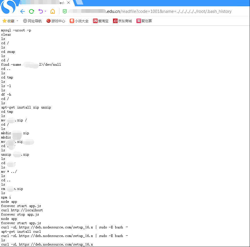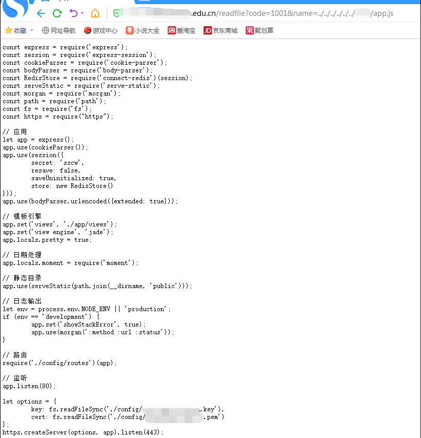 文件读到了,粗略看了一下,部署人员严格按照“部署--删除”流程,没有残留任何压缩包之类的,本来想直接读压缩包下载回来,只能换一个办法,找配置文件。根据历史操作记录得到路径,读入口文件app.js。