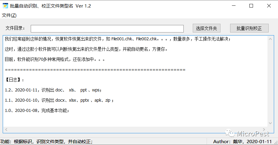 工具写于2020年,当时碰到的问题场景是:有些恢复软件恢复出来的文件都是形如“ File001.chk、File002.chk......”这样的,数量很多,如何快速地归类成为当时的一个问题点。在网上搜寻了一番,没有找到解决此类问题的工具,花了点时间,就写了这么个工具:批量自动识别、校正文件类型名,对恢复出来的文件进行识别类型。