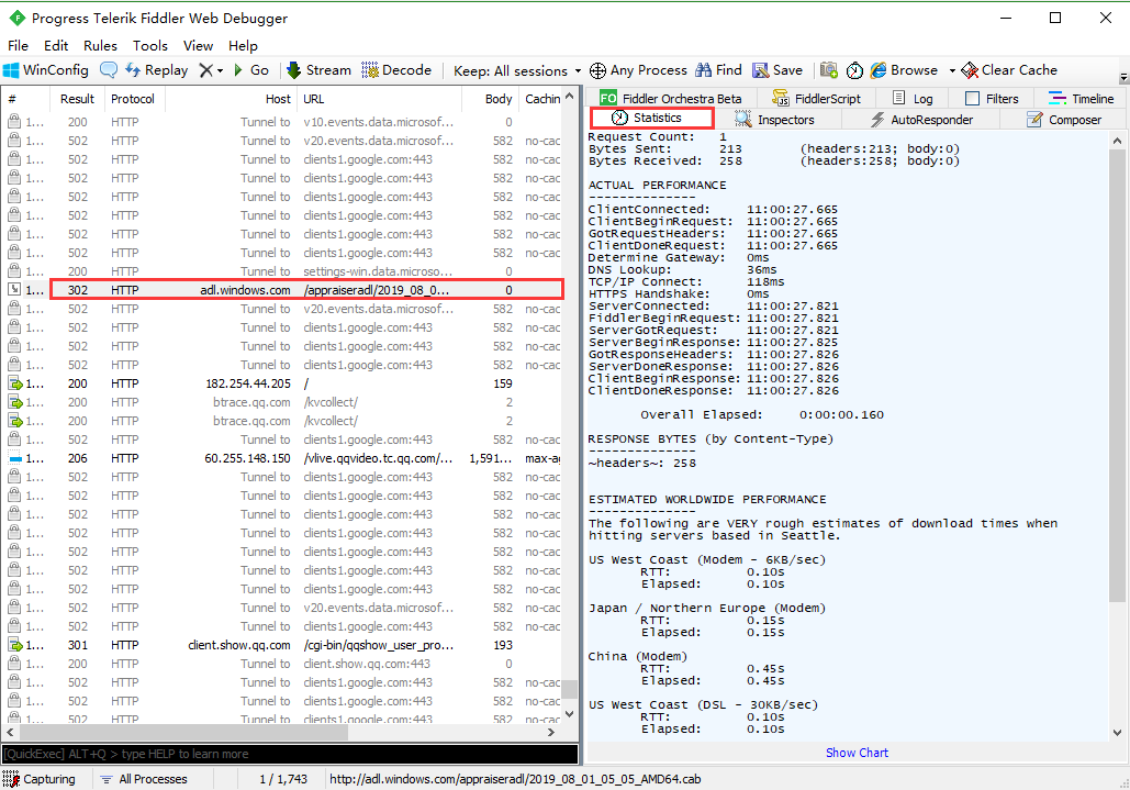 好了,左边看完了,现在可以看右边了;随意点击一个请求,就可以看到Statistics关于HTTP请求的性能以及数据分析了。