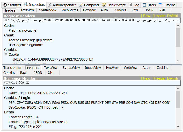 Inspectors是用于查看会话的内容,上半部分是请求的内容,下半部分是响应的内容;