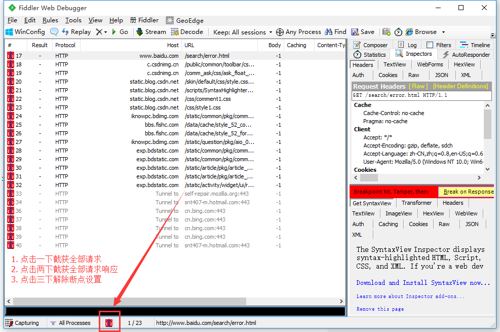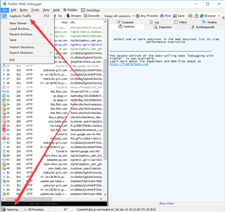 Fiddler想要抓到数据包,要确保Capture Traffic是开启,在“File –> Capture Traffic”。开启后再左下角会有显示,当然也可以直接点击左下角的图标来关闭/开启抓包功能。