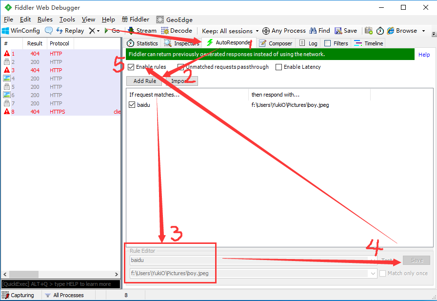 看下图5步,我将“baidu”这个关键字与我电脑“f:\Users\YukiO\Pictures\boy.jpeg”这张图片绑定了,点击“Save”保存后勾选“Enable rules”,再访问baidu,就会被劫持。