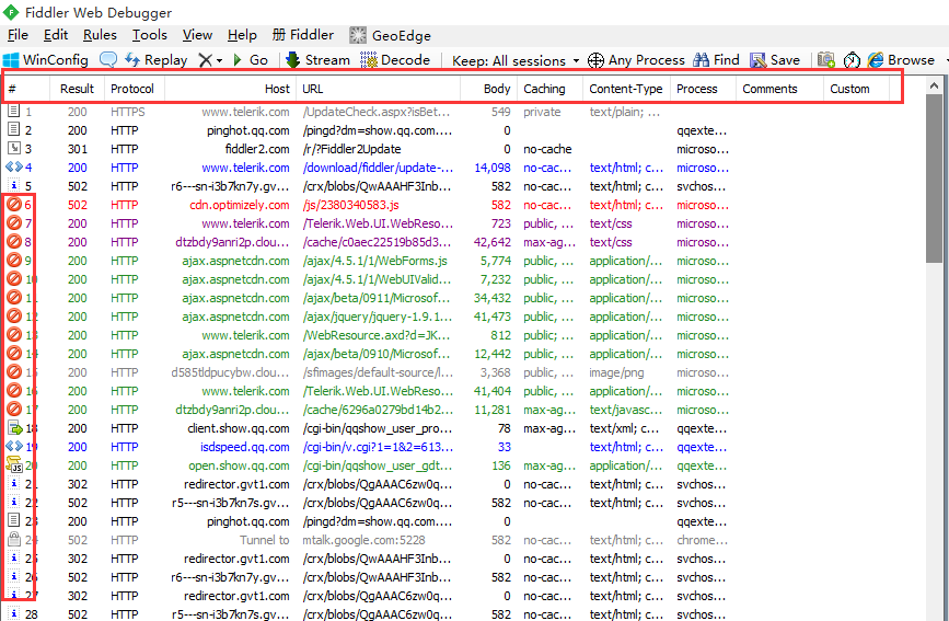 Fiddler开始工作了,抓到的数据包就会显示在列表里面,下面总结了这些都是什么意思?Fiddler