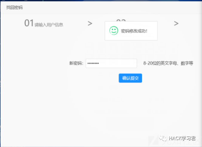 填入验证码,直接跳转到第三步修改新密码,填入新密码后,点击提交