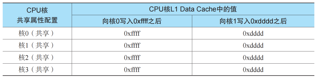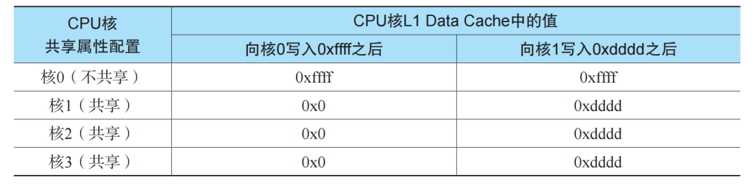 我们在i.MX6Quad sabre开发板上进行如下实验来确认共享属性对Non-secure L1 Data Cache的影响。简单来说,我们让所有4个核都运行在普通世界,访问相同的物理内存(以下简称测试内存),并且所有核的访问都不经过L2 cache。我们先把所有核上测试内存对应的L1 Data Cache都清零,然后向核0的L1 Data Cache写入0xffff并观察其他核上对应的L1 Data Cache 数据变化;之后,向核1的L1 Data Cache写入0xdddd并观察其他核上对应的L1 Data Cache数据变化。实验结果是,当所有核的内存都被配置为可共享时,一个核上的L1 DataCache数据会泄露到其他核,也会被其他核影响,如表1所示。反之,当一个核的内存被配置为不可共享时,其上的L1 Data Cache数据不会泄露到其他核,也不会被其他核影响,如表2所示。