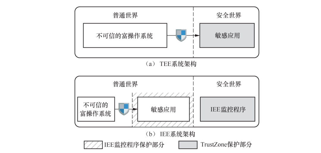 ARM TrustZone技术被广泛用于为移动终端及嵌入式平台提供基于硬件的安全防护。传统的保护方式采用图1(a)所示的可信执行环境(TEE)架构,将敏感应用直接部署在安全世界(secure world)中,以TrustZone的硬件隔离保证敏感应用的安全。但TEE架构下,安全世界的可信计算基(TCB)会随着敏感应用的增加而增加;而且安全世界的应用需要通过设备制造商来部署,这样不方便。为解决这些问题,研究人员提出了图1(b)所示的基于隔离执行环境(IEE)架构的保护方案,安全世界中仅运行一个IEE监控程序(IEE monitor),负责在普通世界构建IEE给敏感应用运行。IEE监控程序确保所构建的IEE能够免受来自普通世界恶意程序或操作系统的攻击。
