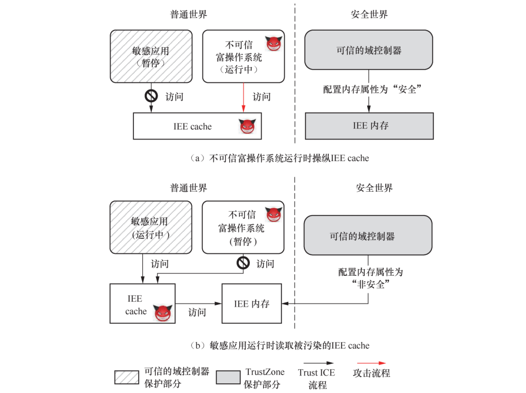 该类型攻击针对场景2,当上下文切换期间的保护措施可以有效实施的情况下,攻击者仍然可能利用上下文切换过程中对cache保护的不完备实施攻击。我们以TrustICE系统为例介绍具体攻击原理。