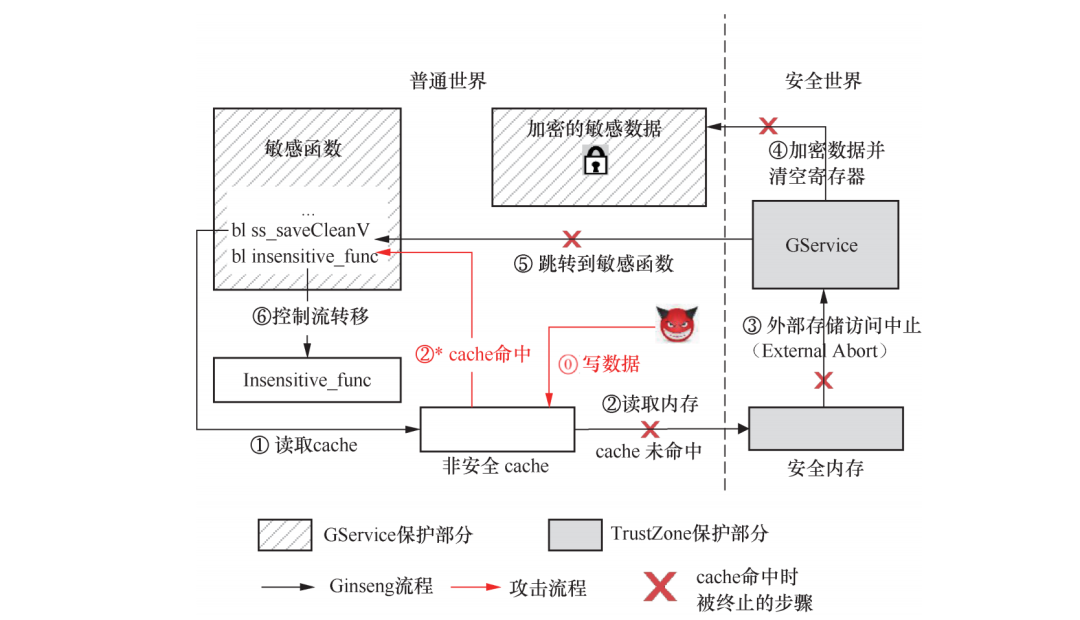 (2) 攻击流程。由于步骤①的内存读取操作是从普通世界发起的,所访问的cache是Non-secure,因此可以被普通世界的恶意程序读写。具体来说,攻击者在步骤①之前将安全内存对应的cache填上数据(即步骤)。此后,步骤①的内存读取操作将碰到一个Cache Hi(t 而非Cache Miss)导致步骤②*而非步骤②被执行。由于步骤②被绕过,步骤③④⑤也均被绕过。由此,在敏感寄存器未被清空的情况下,不可信函数将被执行并可访问其中的IEE数据。类似攻击类型一,在填充安全内存对应的cache之前攻击者也需要获得安全内存的物理地址。实际上,由于Ginseng系统构建的IEE运行在用户空间,其所有的页表都维护在不可信的普通世界操作系统内核中,因此攻击者可以很容易获得该地址。