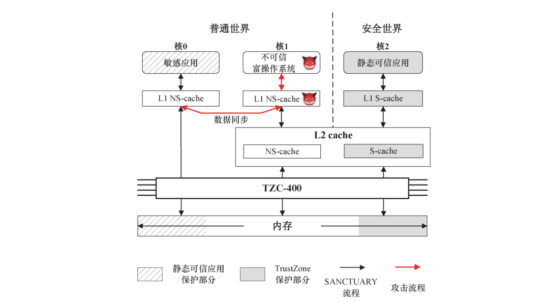 该类型攻击针对场景1,即当两个核并行运行时,跨核操纵核隔离的IEE存储。我们以SANCTUARY系统为例介绍具体的攻击原理。