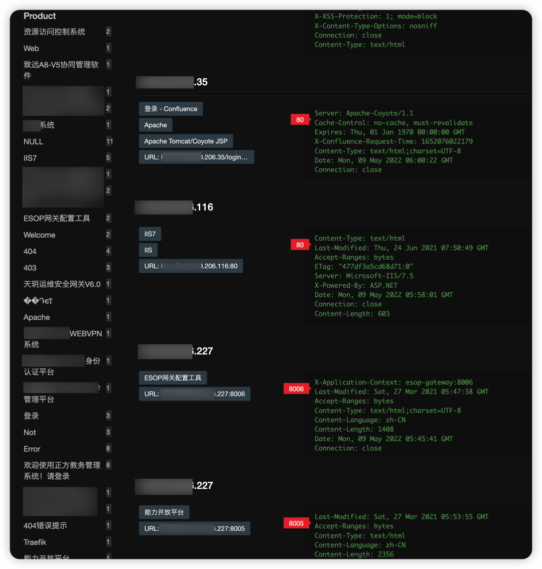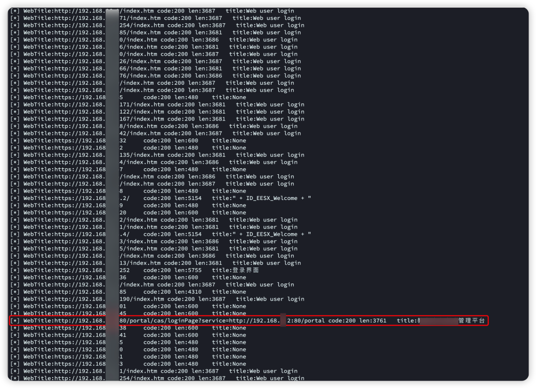 这个时候其实用这两台跳板机器就够了,另外两台存在 MS17010 没必要继续打,随后我对当前 C 段进行信息搜集,对 Web 资产进行扫描存活发现大量 Web 资产: