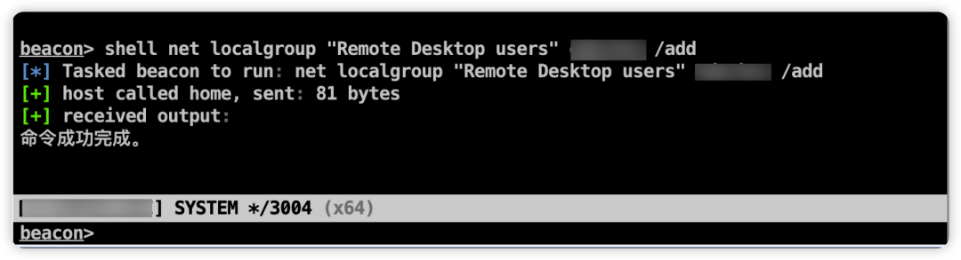随后通过同样的方式把 shell 弹到了 CS 并且添加了用户而且加入远程桌面组: