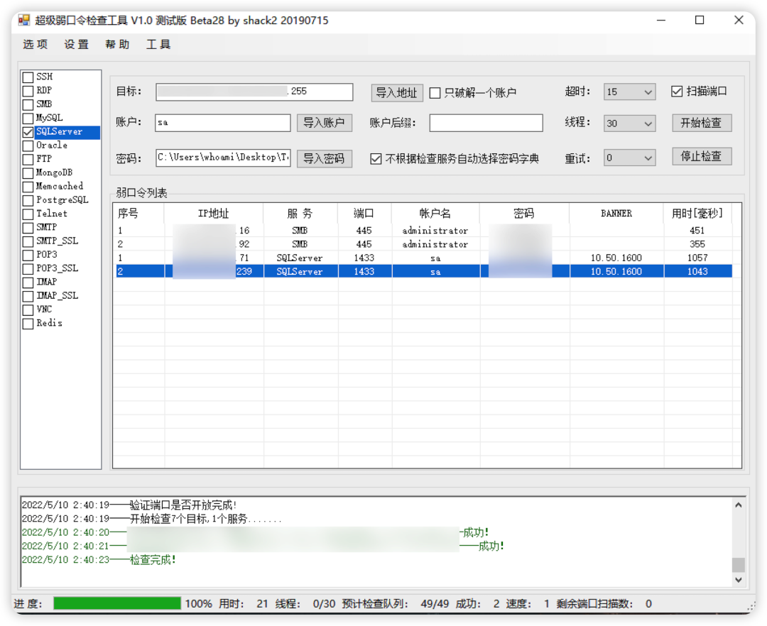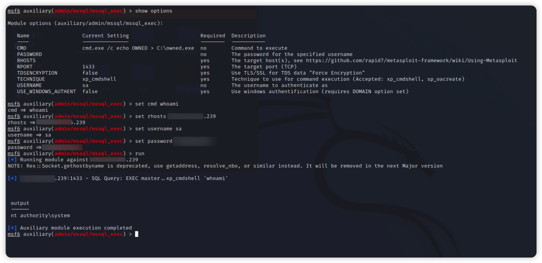 通过已搜集到的密码去对 C 段继续密码喷洒成功喷洒出 C 段的一台 Mssql:xxx.xxx.xxx.239