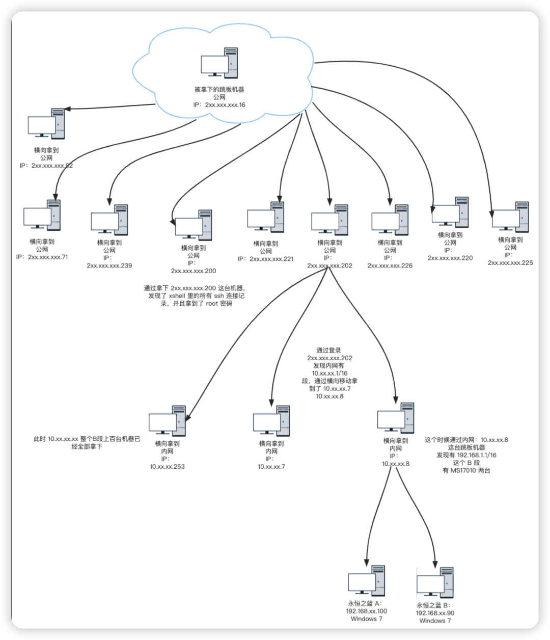 至此这个公网的 C 段基本上已经穿了,大量核心数据库、交换机、Web服务器都拿下,接下来就是对 10 的内网进行内网渗透。